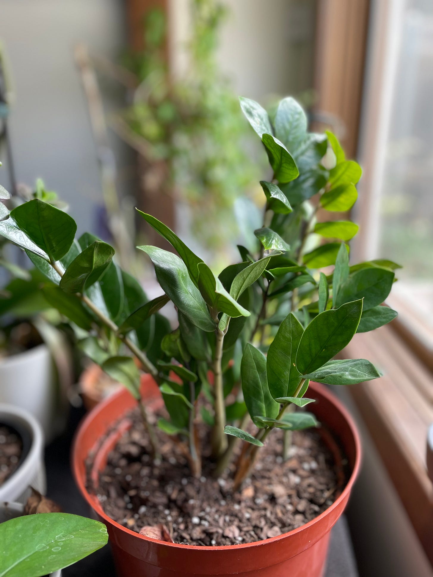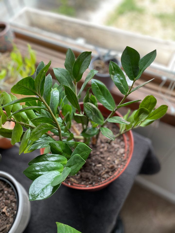 Fast forward eight months, I was super pregnant—probably way too pregnant to be hunched over, trying to re-pot a bunch of plants! My little ZZ plant still had its two sad little shoots, but when I took it out of the pot I discovered something amazing. Beneath the soil was an intricate root system and FIVE new shoots ready to burst up through the dirt. That entire time, the plant had actually been flourishing; it was simply out of sight.